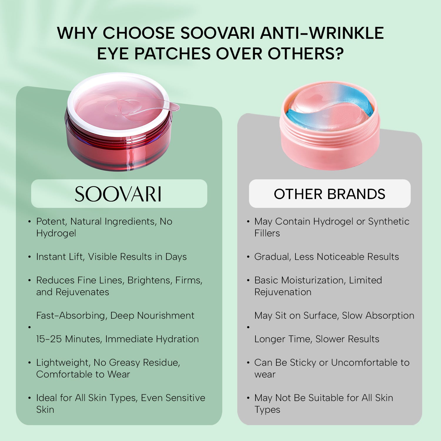 Transform Your Look with SOOVARI Moisturizing Anti-Wrinkle Eye Patches. Our Patches effectively reduce fine lines and rejuvenate the delicate skin under the eyes. The results of radiant skin are visible in a few days.