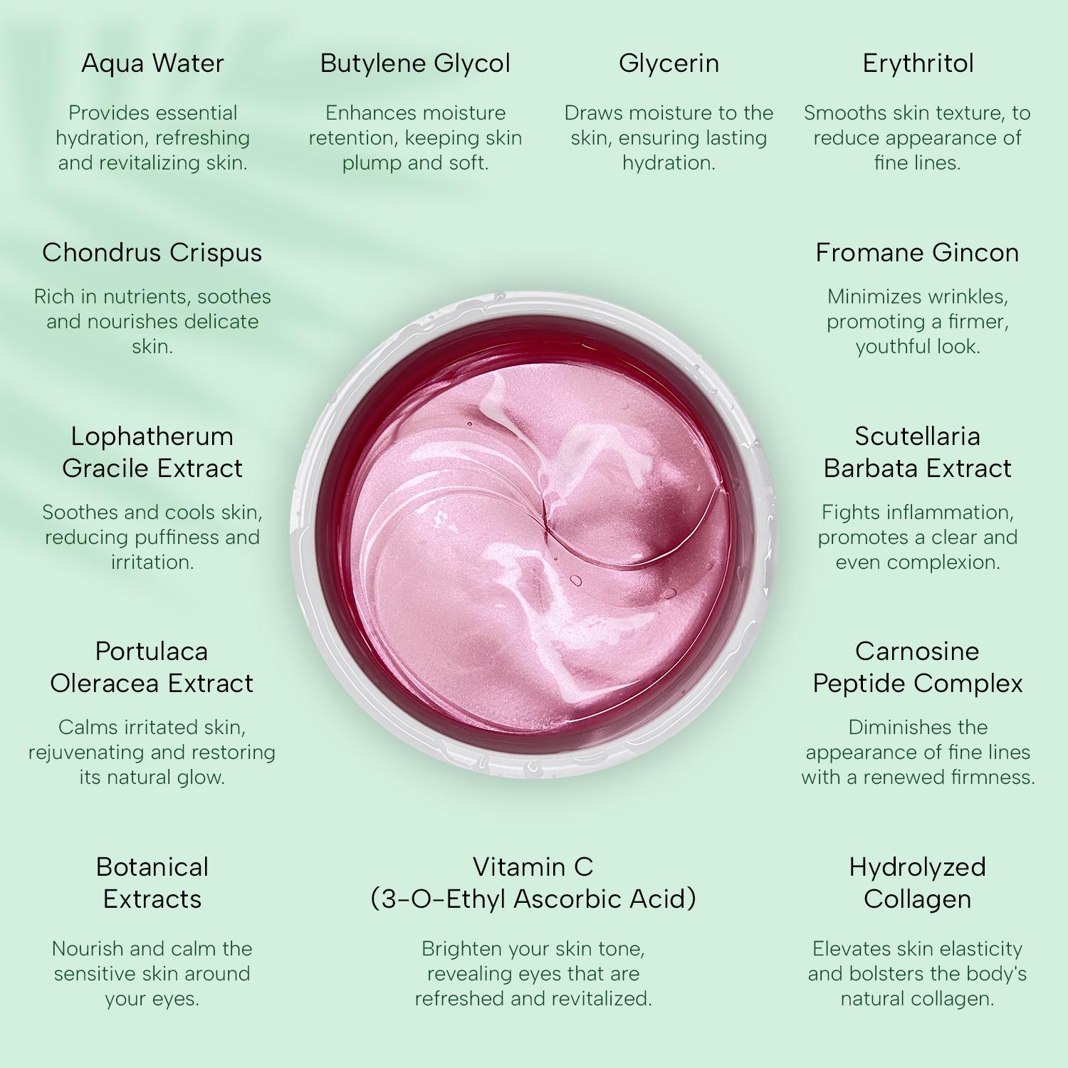 Each patch is infused with a potent blend of carefully selected ingredients that harmoniously nourishes, hydrates, and revitalizes your skin under the eyes.